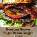 This burger combines juicy beef patties with a sweet bourbon and brown sugar glaze, wrapped in crispy bacon, creating an indulgent flavor experience perfect for any occasion.