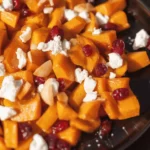 - Transfer the roasted squash to a serving platter, sprinkle with crumbled feta, and drizzle the cranberry mixture over the top.