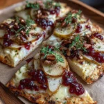 Crispy Flatbread Delight with Brie, Pear, Toasted Pecans & Cranberry Glaze