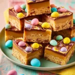 Preheat oven to 350°F (175°C). Grease and line a baking pan with parchment paper. Cream butter and sugar for the shortbread. Mix in flour and salt until crumbly. Press shortbread evenly into the pan and bake for 15–18 minutes until lightly golden. Cool. Heat brown sugar, butter, and sweetened condensed milk until caramel forms. Pour over shortbread and spread evenly. Let caramel set slightly at room temperature. Melt chocolate with cream and vanilla. Spread over the caramel layer. Decorate with mini chocolate eggs and pastel candies. Chill fully in the fridge, then cut into squares and serve.