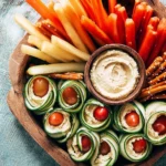 - Arrange all veggies, pita chips, and pretzels around the hummus.