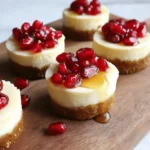Preheat oven to 325°F (160°C) and line a 12-cup muffin tin with paper liners. Mix graham cracker crumbs, melted butter, and brown sugar until combined. Press 1 tablespoon into each liner and bake for 5 minutes. Let cool. In a large bowl, beat cream cheese until smooth. Add yogurt, honey, vanilla, and eggs one at a time, mixing until just combined. Divide filling among muffin cups. Bake for 18–22 minutes, until centers are set and edges are puffed. Cool in pan for 10 minutes, then chill for at least 2 hours in the refrigerator. Top with pomegranate seeds and a drizzle of honey before serving.