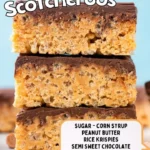 Delicious Scotcheroos Rice Krispie Treats topped with chocolate and peanut butter