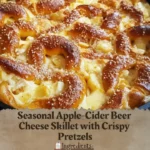 A warm, cheesy skillet dish featuring apple cider and beer, topped with crispy pretzels, perfect for autumn gatherings.
