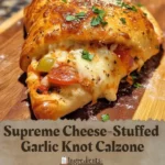 This Supreme Cheese-Stuffed Garlic Knot Calzone is a tasty treat that’s not only fun to make but also satisfying to eat, perfect for any occasion, and a guaranteed crowd-pleaser. Enjoy!