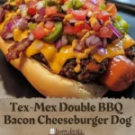 - Serve hot and enjoy your Tex-Mex Double BBQ Bacon Cheeseburger Dog!